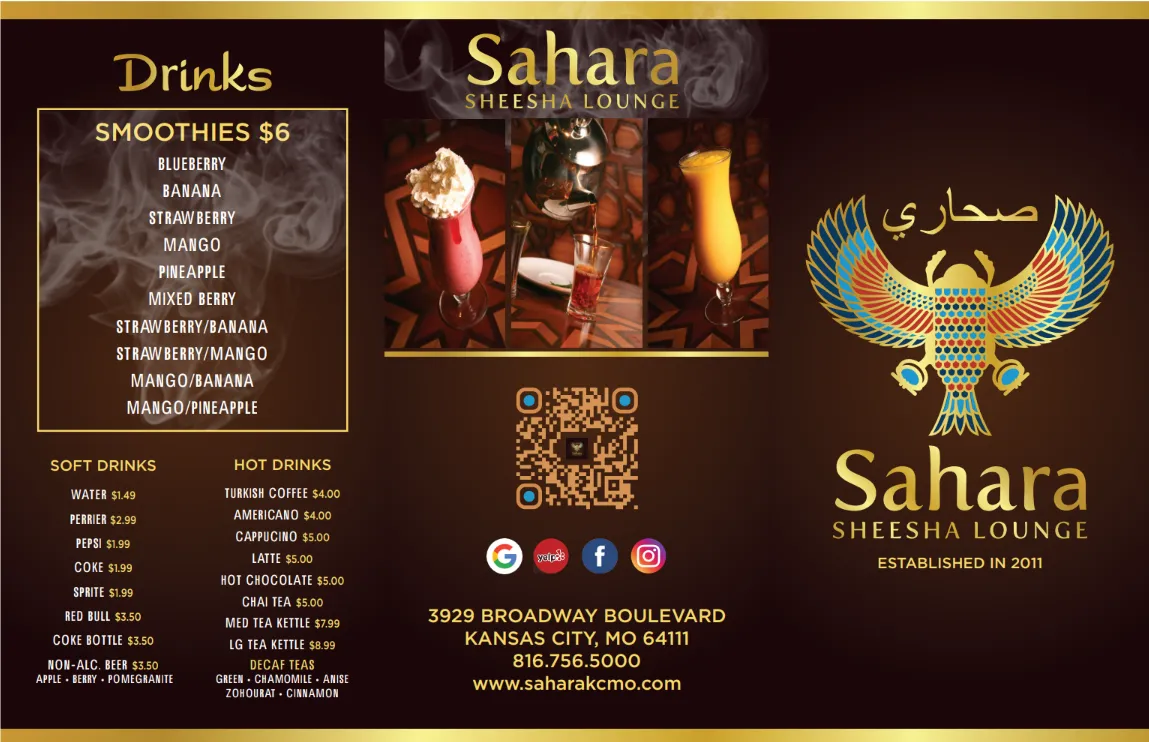 Beyond the smoke, there’s flavor for every craving. Whether it’s the boldness of authentic Turkish coffee, the warmth of traditional teas, or the refreshing lift of real-fruit smoothies and fresh-squeezed juices, Sahara offers something to satisfy and surprise. Every sip is designed to complement the moment.